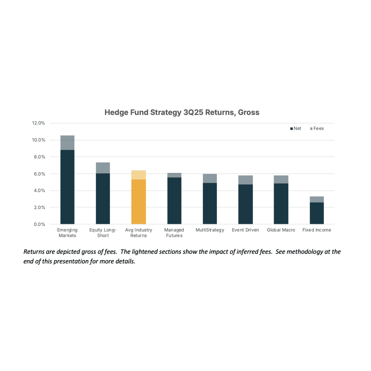 Hedge Funds delivered strong positive performance in Q3-25 with Emerging Market and Equity Long/Short strategies benefitting from rallies in Asian equities while Fixed Income strategies were modestly positive, challenged by tighter credit spreads.