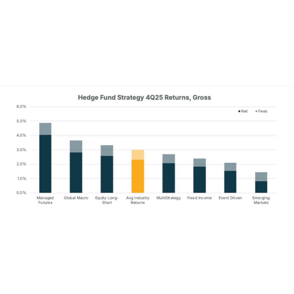 Hedge Funds delivered strong positive performance in Q4-25 with Managed Futures and Global Macro strategies benefitting from rallies in gold and ex-US equities while Emerging Markets strategies were modestly positive, challenged by geopolitical uncertainty.